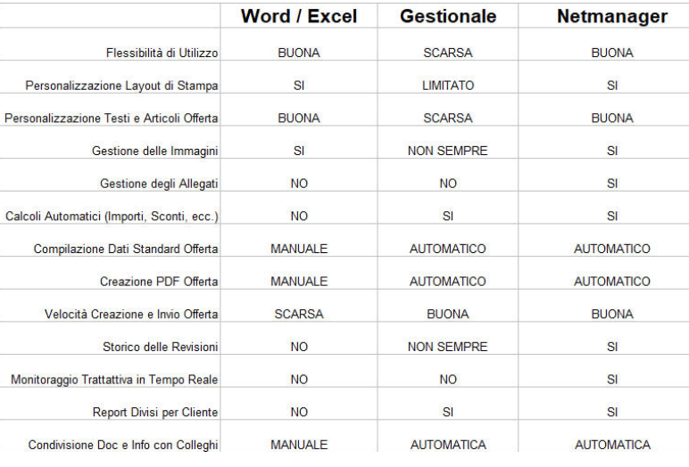 Guarda la Tabella Comparativa fra gli strumenti più utilizzati in Azienda per creare le Offerte (Word/Excel - Gestionale - Netmanager)